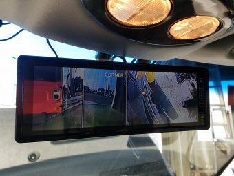 大型のルームミラーモニターの取付をして、常にフロントとサイドの映像を映す事にしました。