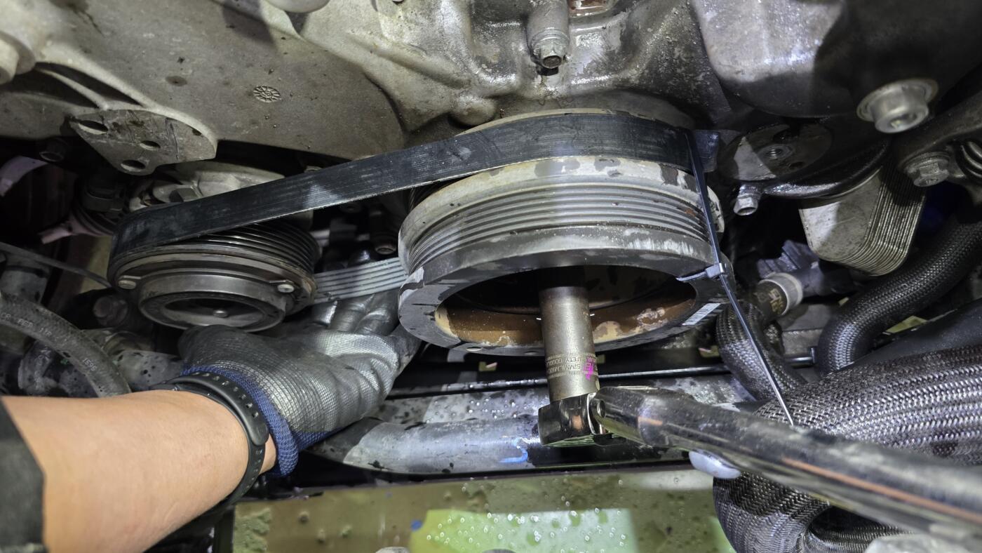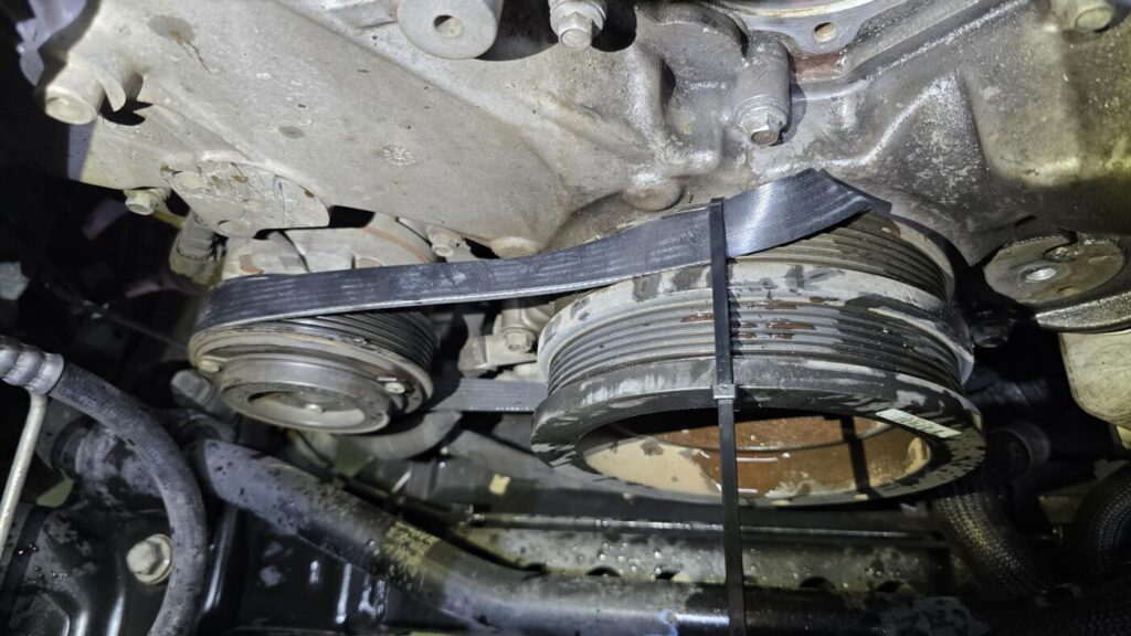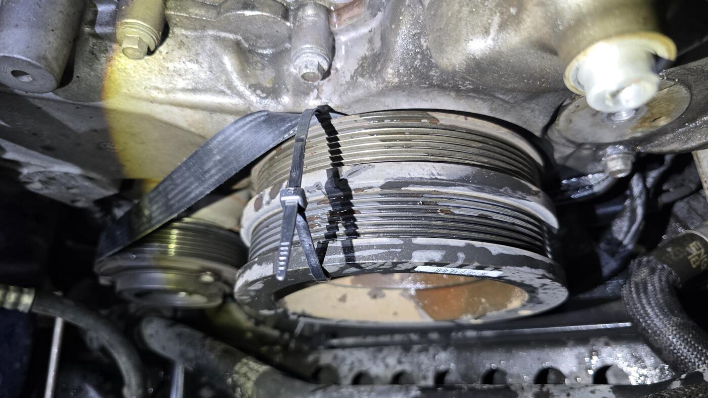 先ずはハーモニックバランサー(クランクプーリー)にベルトを掛けたら写真の様にタイラップを巻き付けします。